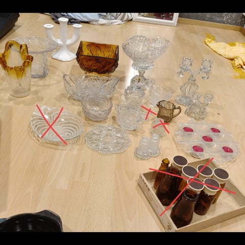 Erilaiset lasiset maljakot ja koriste-esineet eri väreissä, kuten oranssi, vihreä, sininen, punainen ja kirkas. Kokoja ja muotoja vaihtelevat, sisältäen korkeita ja matalia maljakoita sekä pieniä koristelyhtyjä. Materiaali lasi.