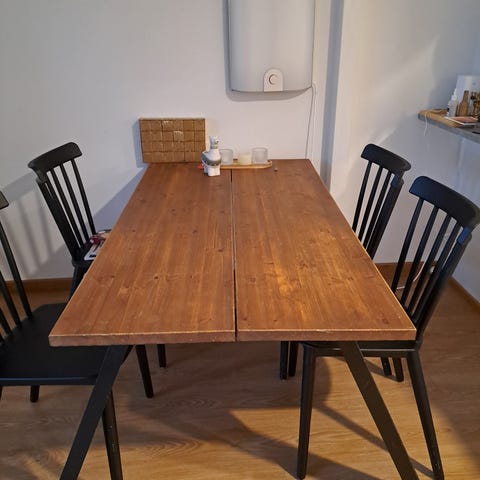 Pöytä on ostettu muutama vuosi sitten maskusta. Pari pientä jälkeä löytyy, toisessa päädyssä on kulmasuojat ja yksi pultti puuttuu pöytälevyn kiinnityksestä mutta ei ole haitannut käyttöä.