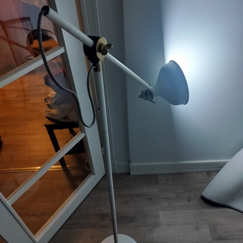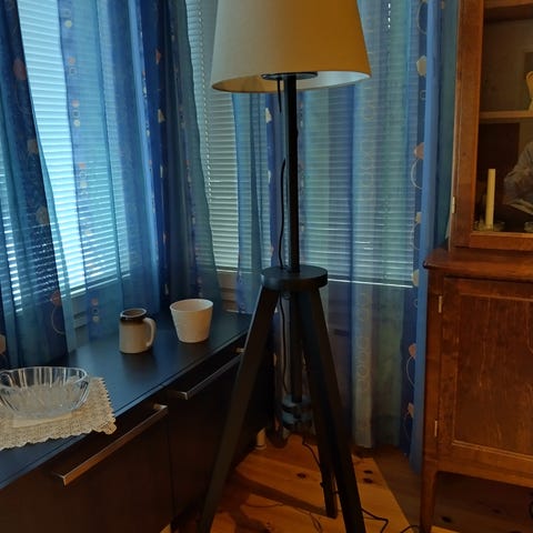 Lattiavalaisin, jossa musta varjostin ja metallinen jalusta. Valaisin on suunniteltu käytettäväksi lattiavalaisimena ja siinä on säädettävä varjostin.