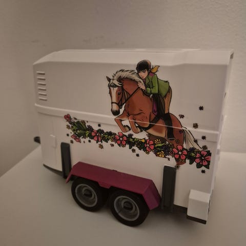 Puinen hevostalli, jossa leikkimistä varten irrotettava katto. Sisällä useita karsinoita. Mukana tulee muovinen heppatraileri.
