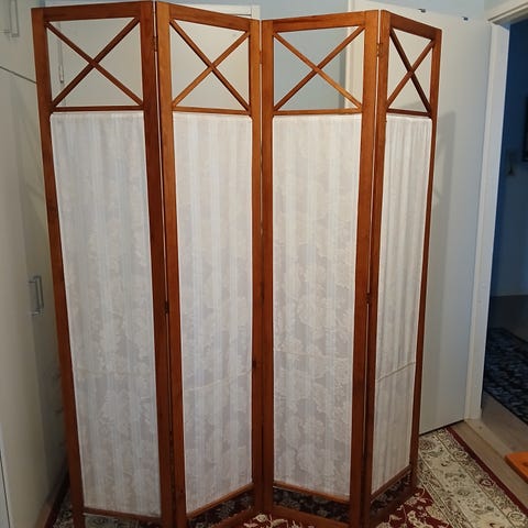 Myydään sermi tilanjakajaksi. Sopii esim. rajaamaan tilaa sängylle tms. Kaunis ja käytännöllinen. Reunat puuta, väliosat osin läpinäkyvää ohutta kangasmaista materiaalia. Muutama pieni jälki/rikkoutuma(kuva) sermin alaosassa. Eivät näy juurikaan. Koko korkeus 180cm, leveys 130cm. Vain nouto. Maksu mobilepay tai käteinen noutaessa.