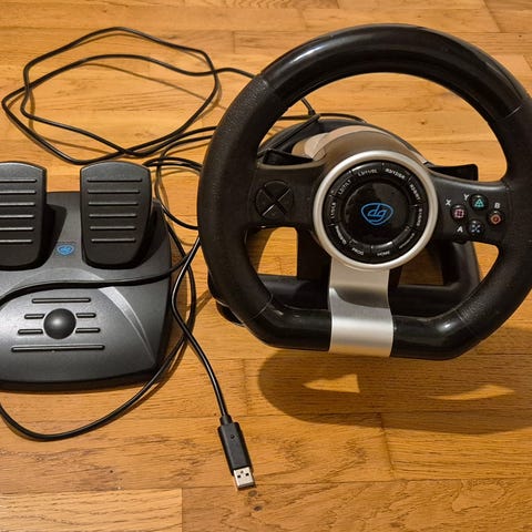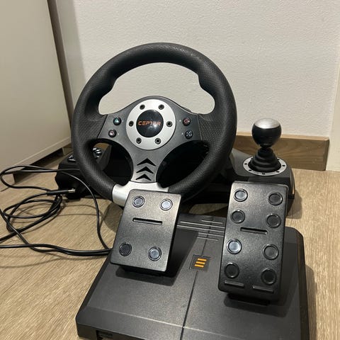 Esperanza Nitro peliohjain rattiohjain, jossa on ohjauspyörä ja vaihdekeppi.