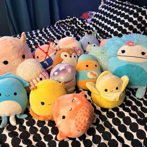 Lajitelma keskikokoisia ja isoja squishmallows- pehmoleluja. Mukana muun muassa Anu Saukko, jossa laputkin vielä kiinni. Muissa ei lappuja. Ei niinsanotusti leikitty, olleet vain koristeena esillä.