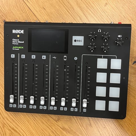 RØDE RØDECaster Pro äänimikseri, jossa 10 kanavaa. Laite sopii esimerkiksi podcastien ja äänen tallennukseen. Sisältää useita liitäntöjä ja säätimiä äänen hallintaan.