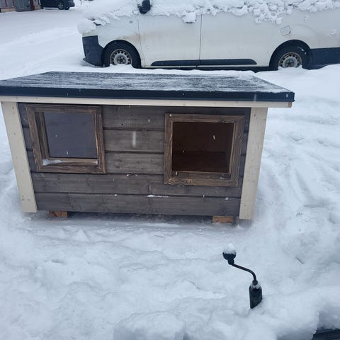 Sisällä koiran kopin lämmitin, joka on paloturvallinen ja ei voi aiheuttaa koiralle vammoja vaikka koira nojaisi lämmittimeen.