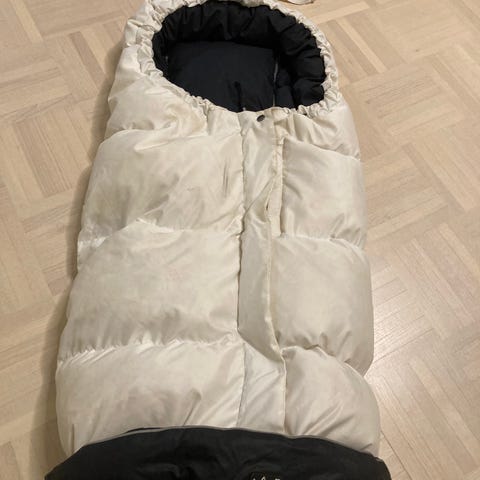 Lämmin lämpöpussi rattaisiin, selkämys lampaanvillaa ja etuosa untuvaa. Erittäin lämmin ja hengittävä. Etuosan saa vetoketjuin pois pesua varten. Reiät viisipistevöille. Uudenveroinen kunto, kuva vääristää väriä keltaiseen, mutta on aivan luonnonvalkoinen!