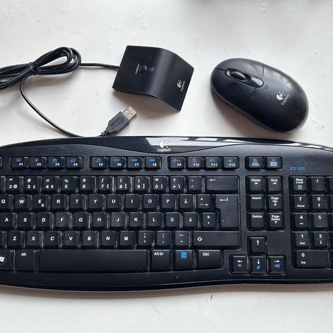 Logitech langaton näppäimistö. USB dongle hukkunut, joten sellainen täytyy olla itsellä jotta yhdistäminen onnistuu. Yksi näppäin puuttuu. Soveltuu tietokoneen käyttöön ja sisältää perustoiminnot näppäimistölle.