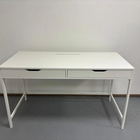 IKEA kirjoituspöytä valkoinen, jossa kaksi vetolaatikkoa ja metallirunko. Pöytä hyvässä kunnossa, ainostaan pinnassa jälkiä (kuva) jotka saa peittoon kirjoitusalustalla tai leveällä hiirimatolla. Taakse laitettu pari viikkoa sitten led-nauha jota ei nyt itse lähdetä irrottamaan. Eli sen saa mukaan.