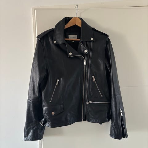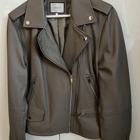 Andiatan vähäisessä käytössä ollut, vaalean roosa nahkatakki. Pehmeää nahkaa. Koko 44, mutta pienehkö vrt Andiatan bleiserit.