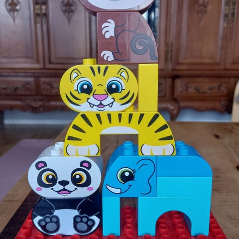 Setti sisältää palikoita, joilla voi rakentaa erilaisia eläimiä, kuten kirahvin, pupun, koiran ja madon.