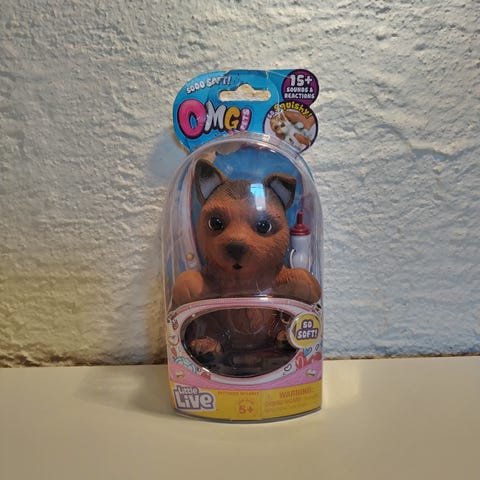 Lucy-koira. Toimii hyvin käskystä. Tämä on vanhempi versio Lucysta. Soveltuu leikkeihin.