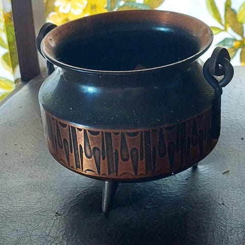 Kaunis, vanha kuparikulho, jossa kolme metallilenkkiä ja alkuperäiset ketjut ripustusta varten. 1950 - 1970-luvulta.
