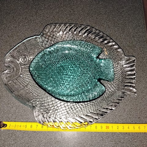 Myydään lasinen kalalautanen. Nouto Inkoosta tai Espoon keskuksesta.