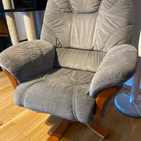Nojatuoli, jossa todella mukava istua. Puuosat hyvässä kunnossa. Kangas hiukan likainen ja kulahtanut.