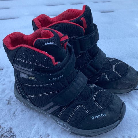 Treksta Bow Mid gtx lasten talvikengät koossa 35. Sisämitta n 22,5cm. Kärjessä vähän harmaantumaa. Tarrat juuri siististi vaihdettu suutarissa joten ne pitää tosi hyvin. Tarraremmin sisäpuolella kulumaa mutta ehjät. Lämmin vuori ja pitävä pohja. Sävy jossain aniliinin ja violetin välissä.
