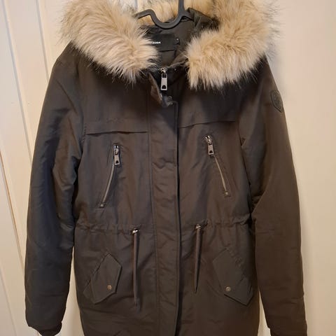 Vero Modan vihreä naisten parka, koko S. Takissa on huppu, jossa on irrotettava karvareunus. Vyötäröllä kiristysnauha.