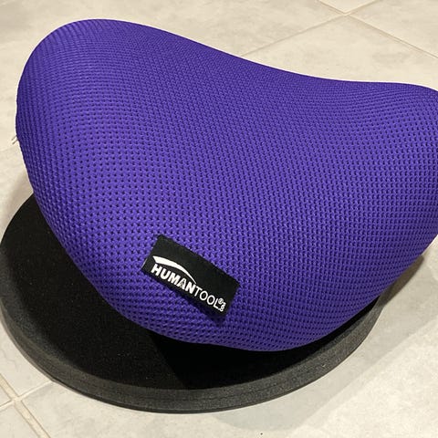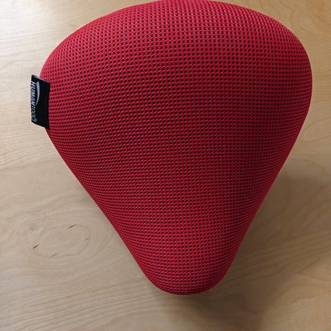 Myydään hyväkuntoinen punainen satulatuolin istuin, jonka voi asettaa tavallisen tuolin päälle. Humantool: https://humantool.com