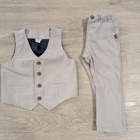 Cool club harmaa puuvillainen poikien juhlapuku, koko 92. Settiin kuuluu liivi, housut, valkoinen pitkähihainen body, rusetti ja jonkinlainen viitta. Liivissä näkyy kulumaa ja pieniä vaurioita nappien reikien kohdalla. Muuta vikaa en äkkiseltään löytänyt. Viimeisen kuvan kravaatti ei kuulu pakettiin eikä kuusikuvioinen paita. Mutta antaa osviittaa liivin ja housujen istuvuudesta.