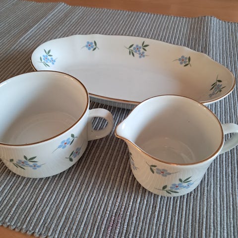 Aravian Sinilintu muki ja lautanen. Ehjä, tummentumaa kupin sisällä pohjassa.
