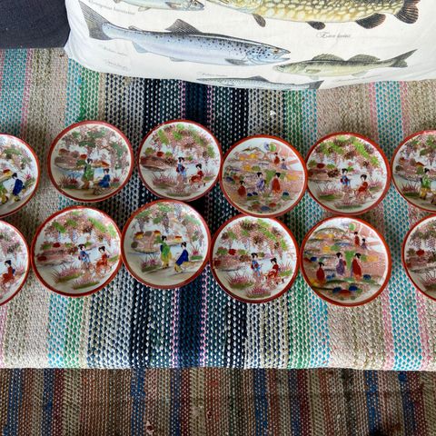 Laaja käsinmaalattu posliiniastiasto. Ruokailuastiat 24 hengelle, isompi kahviastiasto, runsaasti tarjoiluastioita. Yhteensä 148 osaa. Maalattu käsin Suomessa.