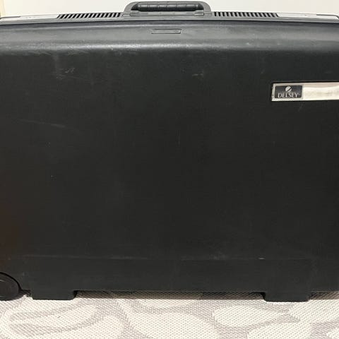 Trenta by deloksen pieni matkalaukku pyörillä. Leveys noin 30cm, korkeus jalkojen kanssa noin 50cm ja syvyys noin 14cm. Edessä yksi pieni tasku ja isompi tasku. Sisällä tavaraosio klipsujen kanssa sekä toisella puolella vetoketjullinen tasku. En valitettavasti postita.