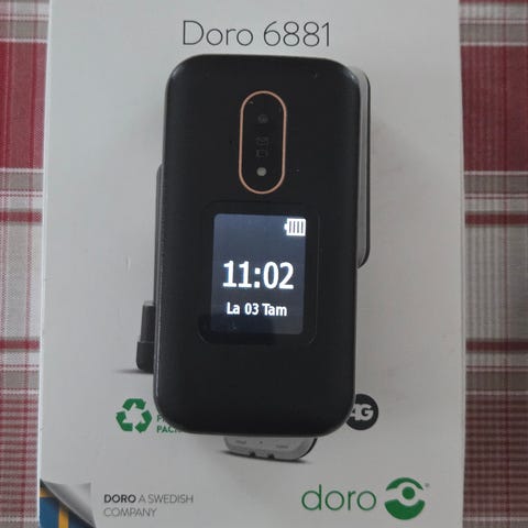 Käyttämättä jäänyt Doro puhelin. Pakkauksessa laturin johto, latausteline, nappikuulokkeet ja kosketuskynä.