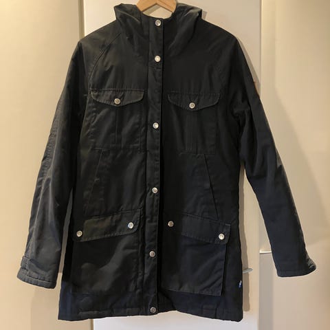 Fjällräven Nuuk -parkatakki koossa S. Mitoitus on tässä takissa tyypillisesti reilua. Paljon käytetty, mutta laadukkuutensa ansiosta edelleen siistissä kunnossa. Takkia ei ole pesty, joten pesu jää halutessaan ostajalle. Muuten ei mielestäni pesua kaipaakaan, mutta kauluksessa nähtävissä hieman meikkivoidetta tms.