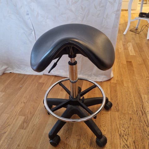 Vähällä käytöllä ollut satulatuoli. Musta yksiosainen tuoliosa nahkaa/keinonahkaa, metallirunko, pyörällinen. Korkeussäätö ja kallistus. Alin korkeus 58 cm, ylin korkeus 76 cm. Säätömekanismit toimivat.