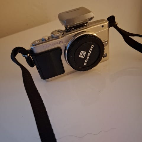 Olympus PEN E-PL1 järjestelmäkamera hopeanvärinen. Kamerassa on vaihdettava objektiivi, kääntyvä näyttö ja kiinteä salama. Mukana on myös laturi ja kamerahihna.