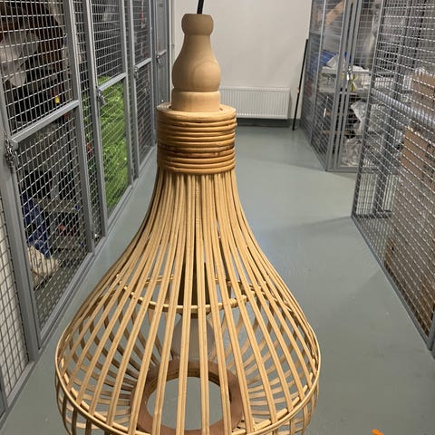 Valaisin on valkoinen ja siinä on koristeellinen lehtikuviointi. Halkaisija on noin 50 cm.