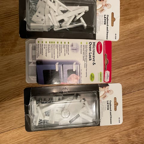Erilaisia lapsilukkoja, laatikkostoppareita ja terävän kulman suojia. Nämä eivät tulleet meillä käyttöön