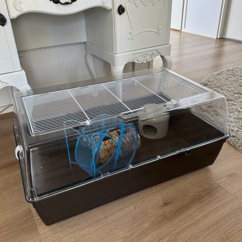 Iso hamsterin häkki. Mukaan juoksupyörä, pesämökki, pesä ja kuljetuskoppa.