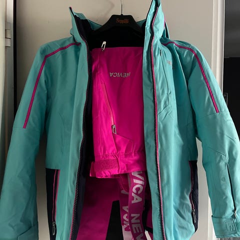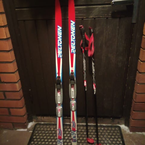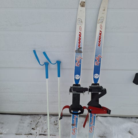 Lasten sukset, pituus 130 cm ja sauvat, pituus 105 cm, sns-side.