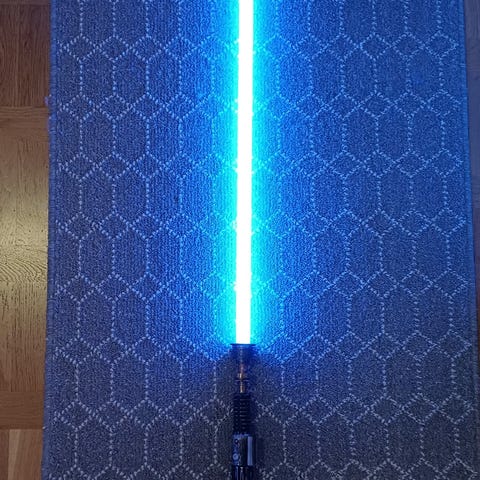 Uutena ostettu jonkun verran käytössä ollut väriävaihtava valomiekka. Mukana teline ja työkalu, jolla miekan saa kiinnitettyä varteen. Miekasta kuuluu myös ääniä. Ohjeet mukaan. Pitkän koon ja rikkoutumisen vuoksi vain nouto!