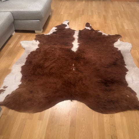 Hienot Beige luonnonvaalea lehmän talja noin 220x180 cm hp 100 e sekä pyöreä beige talja 150x150 hinta 70 e molemmat yhteensä 160 e