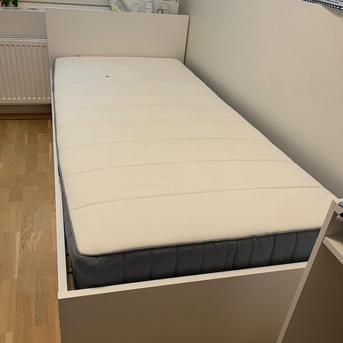 Jysk sänky, harmaa verhoilu, puujalat. Sopii makuuhuoneeseen, ollut vierassänkynä, vähän käytetty ja siisti. Ergonomisesti hyvä ja tukeva. Vain nouto.