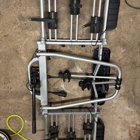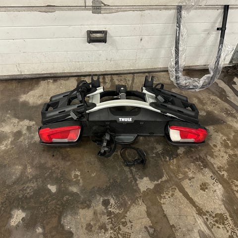 Myydään Thulen helppokäyttöinen polkupyöräteline. Sopii autoon, jossa vetokoukku. Kiinnitysremmejä käytetty maltillisesti eikä niissä ole huomattu liiallisesta venymisestä tulleita murtumia.