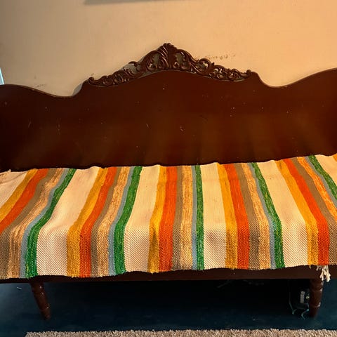 Vanha kaunis sivustavedettävä puusohva. Pientä korjausta vaatii selkänojan ja käsinojan liitos. Katso kuva. Käytössä ollut tähän asti.