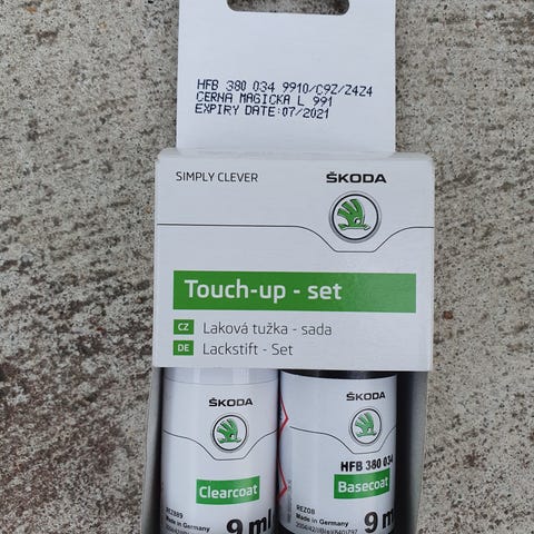 Skoda HFB 380 086 Touch-up set, käyttämätön, säilytetty tasaisessa huoneenlämmössä tiiviisti suljettuna. Kaksi 9 ml pullollista: pohjamaalin (Basecoat) ja kirkaslakan (Clearcoat). Maalikynä / maalipuikko.
