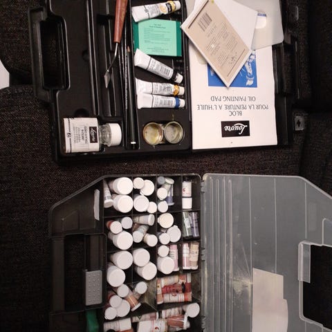 Arvio 80 väriä. Pakki on huonokuntoinen, kansi ei mene kiinni kunnolla, värit vanhoja kuitenkin varastoitu kuivassa sisätilassa. Pakin sisällä myös kyniä, pensseli ja muita tavikkeita.