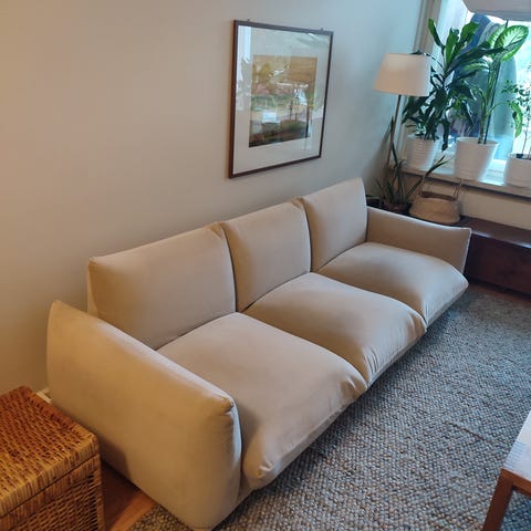 Kuvissa istuisyvyys näyttää isommalta mitä on, Elloksen sivuilla lisää selkeitä kuvia: https://www.ellos.fi/ellos-home/cinlay-sohva-samettia-3-n-istuttava/1536894-01