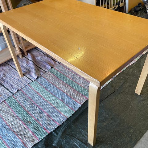 Ilmeisesti Eero Aarnion suunnittelema parhaan tiedon mukaan. Yli 20 vuotta vanha. Maalautettu aikoinaan kauttaaltaan valkoiseksi. Muutamia käytönjälkiä löytyy ja tunnistelappua / leimaa ei ole tallessa. Aikaisemmin ilmoitin virheellisesti Artekin pöydäksi.