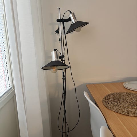 5 haarainen valkoinen kaarivalaisin, marmorijalka, kytkin virtajohdossa, kaaret voi kääntää eri suuntiin, myös kupuja voi säätää.