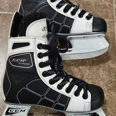 CCM jääkiekko luistimet lasten koko 30. Luistimet ovat mustavalkoiset, joissa sinisiä yksityiskohtia. Soveltuvat jääkiekkokäyttöön.