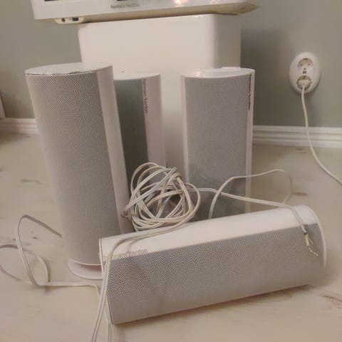 Harman/Kardonin AVR 255 5.1 kaiutinsarjalla, sekä Infocus T90 projektorilla. Kaiuttimissa johtoa jopa isompaankin olohuoneeseen