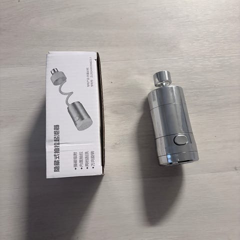 Keittiöhanan poresuutin, adaptereita sovitukseen ja kaksi avainta.