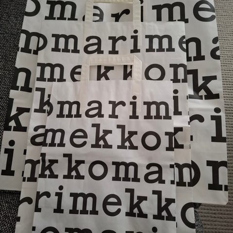 Hyväkuntoisia Marimekon paperikasseja yksi iso ja kaksi pienempää. Yhteensä kaikki 10 e
