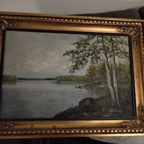 G. Karjalainen maisemamaalaus vuodelta 1939. Maalaus esittää metsän ja joen maisemaa, jossa on runsaasti vihreän sävyjä. Teos on kehystetty koristeellisella kehyksellä. Koko 99 x 73.
