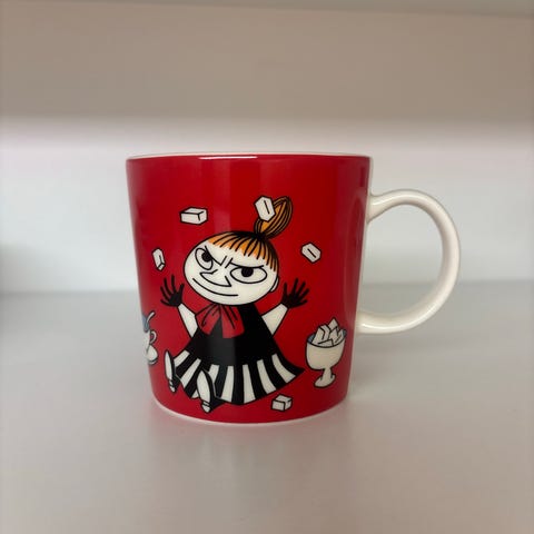 Arabia Muumi muki (Muumipeikko) ja lautanen (asetti), joissa on Muumi-aiheinen kuvitus. ABC collection.