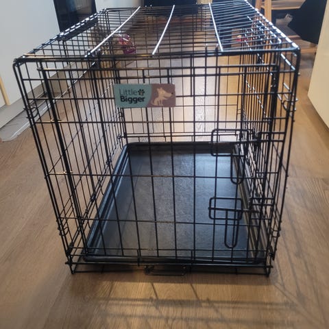 Hyväkuntoinen kevytmetallihäkki. Ollut pennulla käytössä, mutta kasvoi tästä ohi.